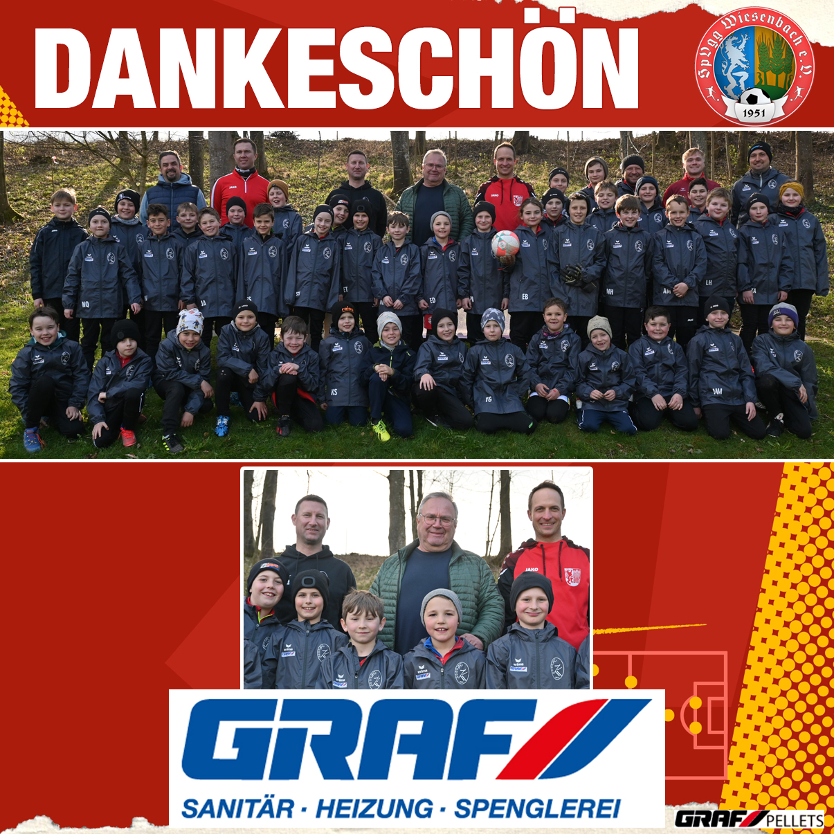 Die F- und E-Junioren der (SG) SpVgg Wiesenbach durften sich zum Saisonstart über neue Regenjacken freuen. Dank der großzügigen Unterstützung der Graf GmbH aus Niederraunau sind die jungen Kicker nun bestens für jedes Wetter gerüstet.